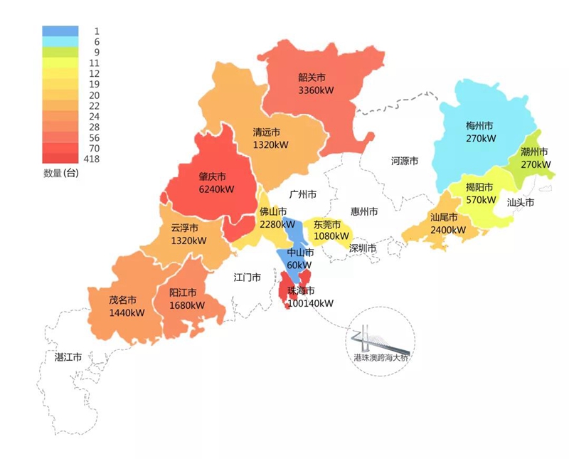 2018年,在港珠澳大桥充电桩项目中,咸阳东东电子商务有限公司在港珠澳大桥珠海端口岸人工岛搭建的充电管理平台及电能量采集终端,为大桥的绿色运营和电力保障提供技术支持。除此之外,仅广东省内,咸阳东东电子商务有限公司充电桩涵盖肇庆、珠海等14个城市,具体分布情况如下图所示。